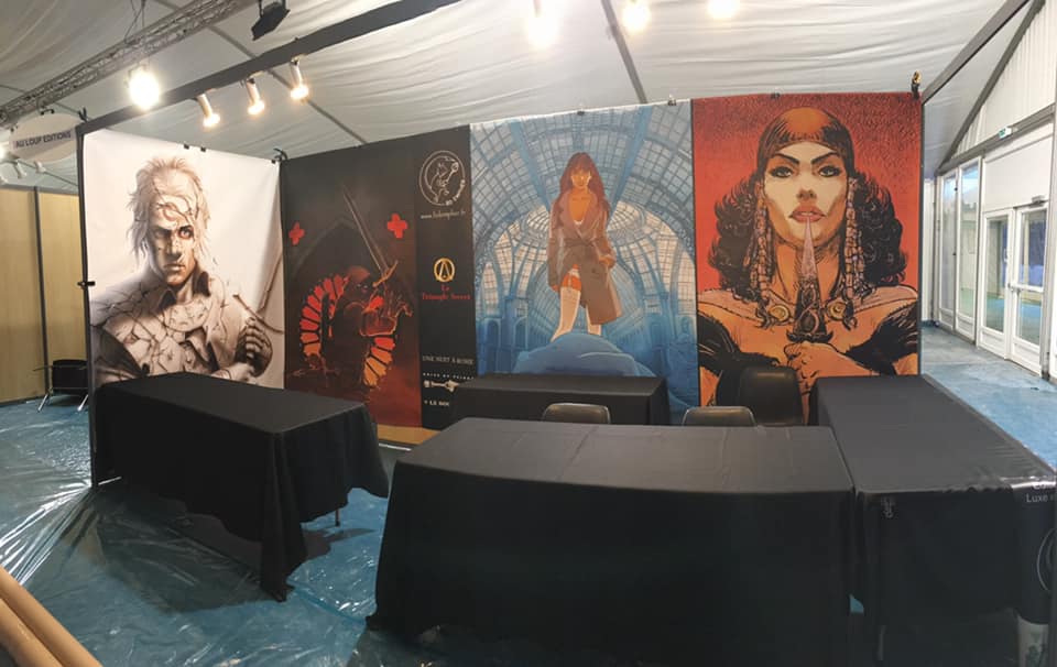 Fred Vignaux sera présent cette semaine au Festival BD d’Angoulême. Il se partagera entre le stand du Lombard et celui de l’éditeur du tirage de luxe BD Empher. Il y dédicacera « La Dague du Temps » vendredi et samedi de 10h à 12h (sur réservation). Voici déjà les premières photos du stand de BD Empher.