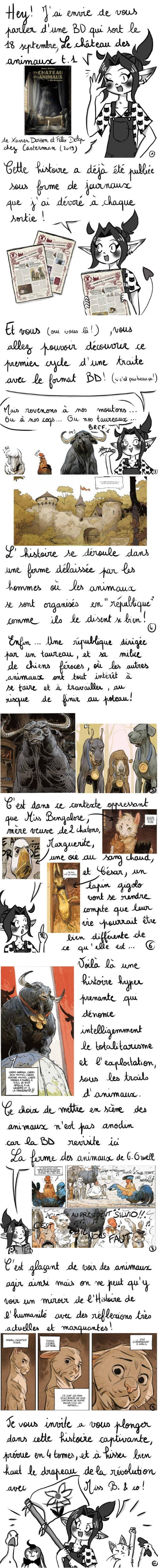 « Après une prépublication en gazette, dont Casterman a fait une habitude très agréable, Le Château des Animaux tome 1 est enfin dans les rayons des libraires. Répéter que c’est un des vrais évènements de cette rentrée finit par être un lieu commun. A craindre presque d’avoir été envoûté par le duo Xavier Dorison, émule de l’enchanteur Merlin, et le jeune Félix Delep, roi Arthur en puissance qui, en quelques traits, a délimité son nouveau royaume. Aller, revenons à cette fable, conte picaresque, animalier, hymne à la liberté pas obligatoirement au bout des fusils. Une dictature dure, pas pure, violente, sanglante, avec des références évidentes que Dorison ne cache pas mais dont l’espoir n’est pas absent. Félix Delep s’y est investi, talent, corps et âme. Le résultat est époustouflant sur tous les plans.