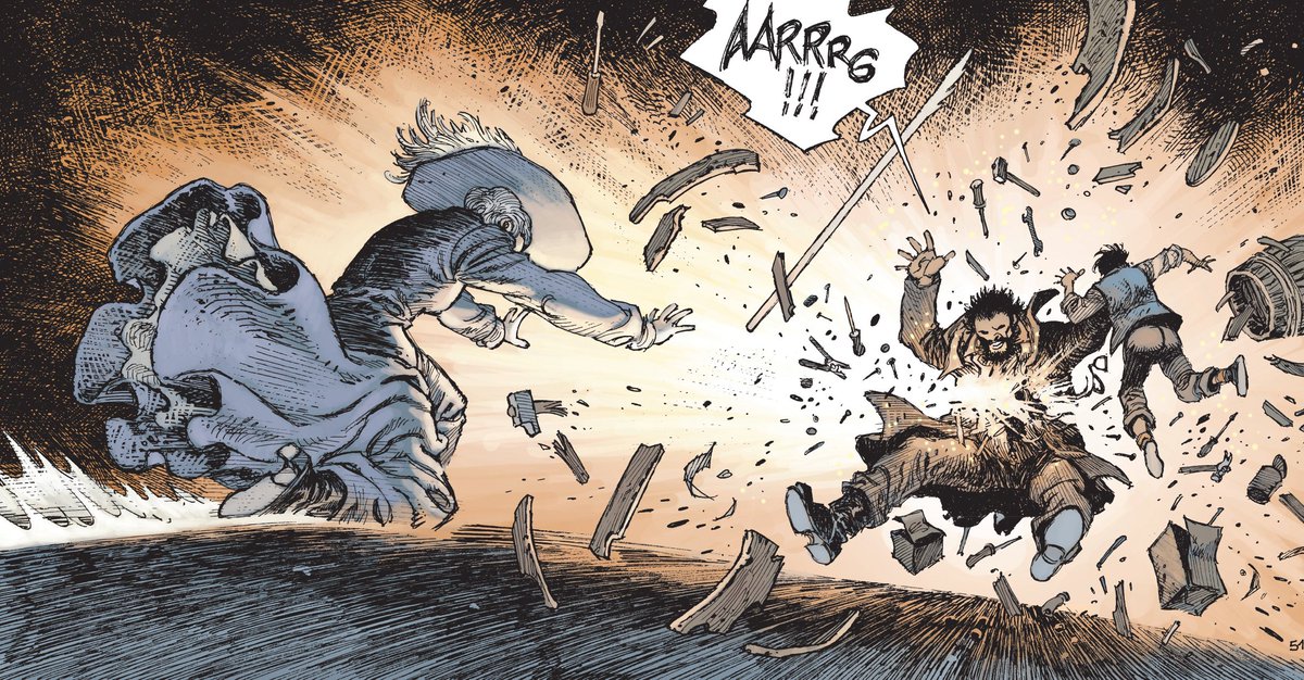 Beaucoup d’hémoglobine bien flashy (la scène de fin du combat au pied de la montagne en est une belle illustration) et des onomatopées sorties de Lanfeust et consorts, à grand renfort de « SPA », « SPO », « SKRÖ », « SHROK », « KROK » et autres (et que je n’apprécie franchement pas, surtout dans un cadre historique bien défini).Pour le coup, que trouve-tu à ces onomatopées en particulier? Lesquelles auraient-tu préféré?