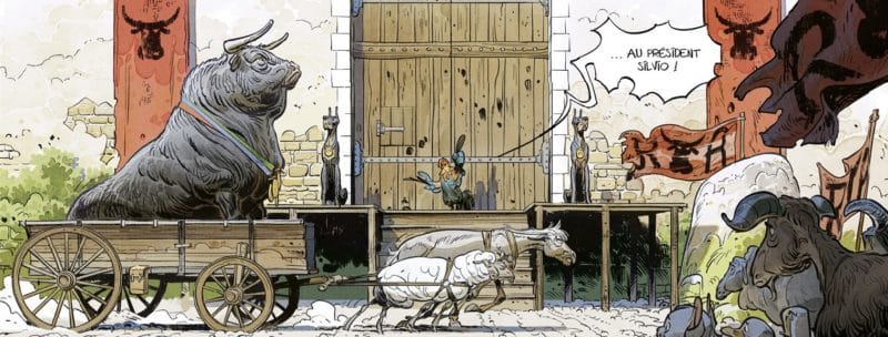 Pour créer des personnages, le principe est souvent le même. On se demande quel est le thème de l’histoire, ici la violence et la révolution. Quel sera le personnage qui aura le plus de trajet humain à faire ? Le premier, c’est celui qui pense que baisser la tête est la solution, en l’occurrence Miss B. Après il y a les valeurs positives et négatives. Le taureau, personnage le plus puissant, c’est pour l’oppression. Ceux qui sont dans l’obéissance négative, ce sont les chiens avec des variantes. Ensuite quels sont ceux qui acceptaient la collaboration puis la refuse comme César ? Comment les gens vont se comporter face à une dictature ? Il y a toutes les nuances et je montre leur évolution.