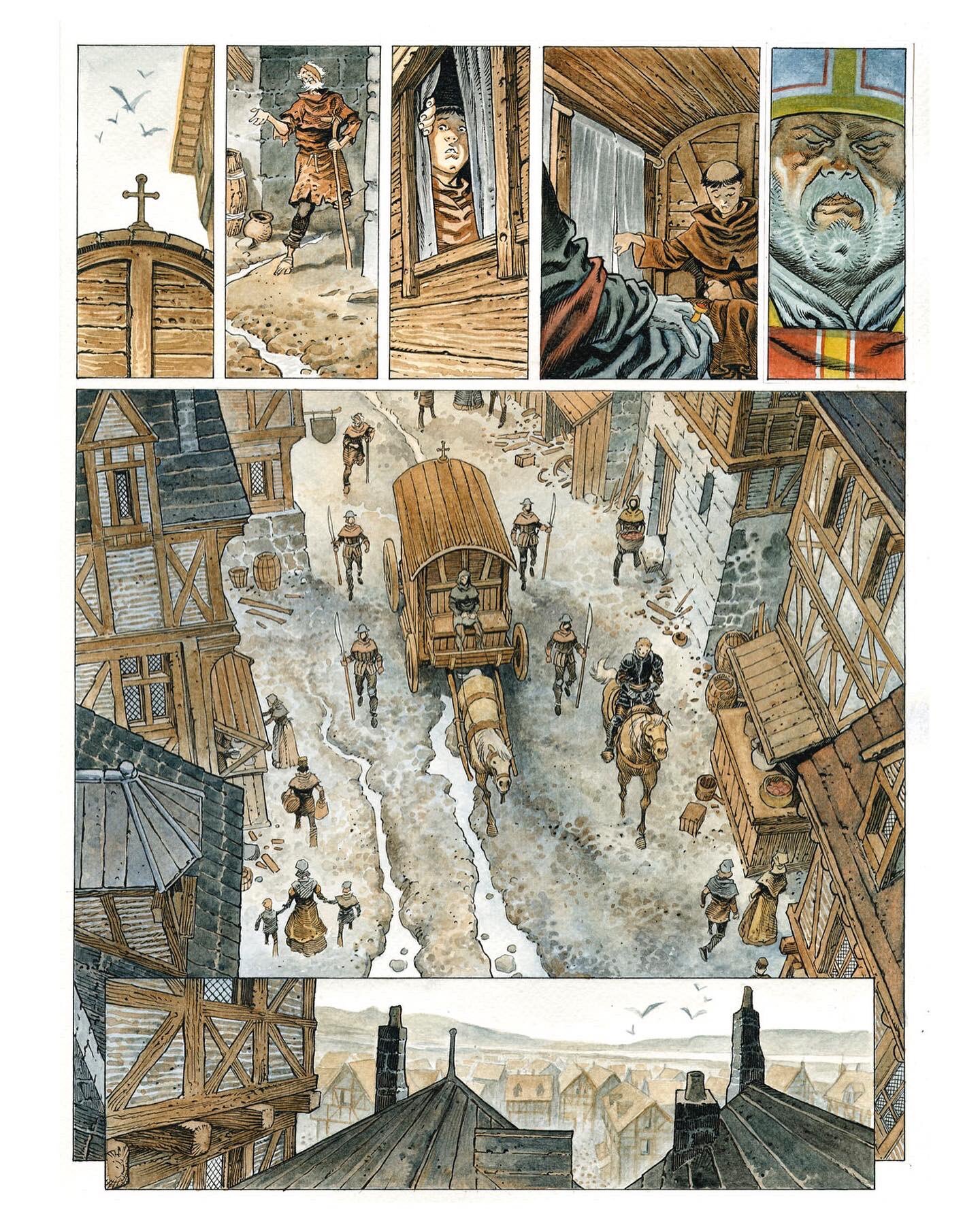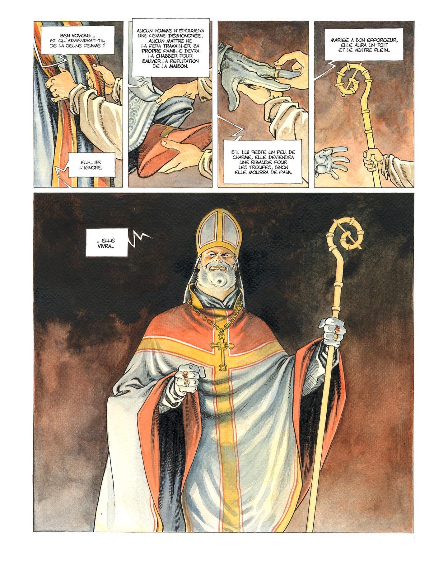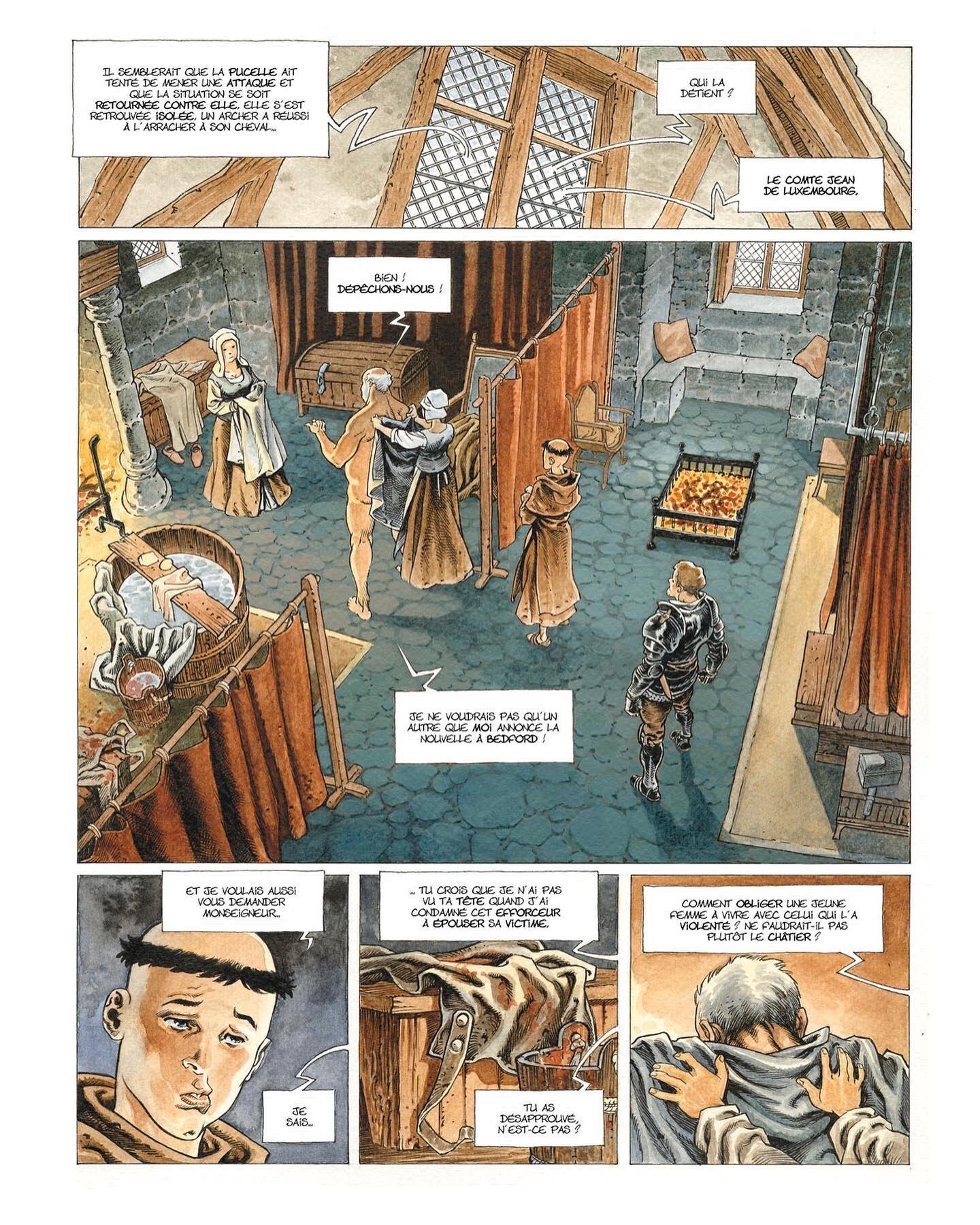 Et déjà, Xavier Dorison et Joël Parnotte ont repris leur collaboration, cette fois pour un one shot intitulé Cauchon. Pierre Cauchon, l’évêque de Beauvais, a en 1431 présidé le tribunal qui jugera et condamnera Jeanne d’Arc. Les auteurs nous préparent cette fois un roman graphique à orientation historique. En voici de premières planches :