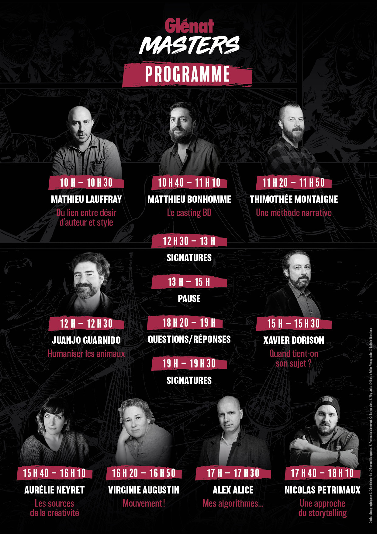 qui rêvait d’un moment plus privilégié avec les auteurs qu’il admire. Une opportunité qu’il n’a jamais trouvée jusqu’ici.Les thèmes abordés sont variés et intéresseront tant les jeunes auteurs que les passionnés du 9e art : « Une méthode narrative », « Humaniser les animaux », « Quand tient-on son sujet ? » ou encore « Les sources de la créativité ». Large programme…
