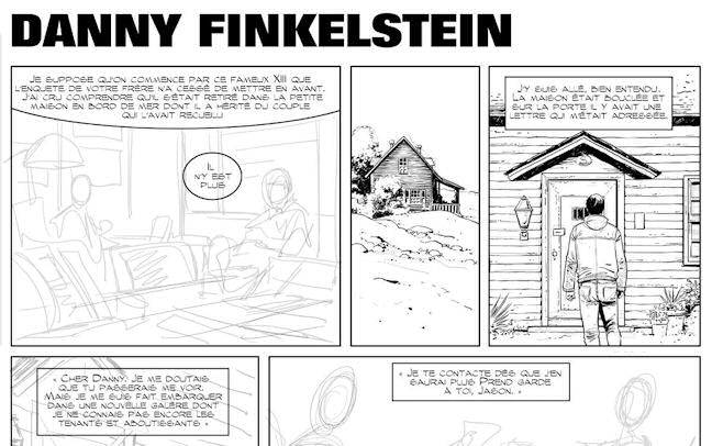 « Je me suis d’abord replongé dans l’univers de « XIII » en relisant les albums, en regardant de plus près les dessins de William. Le plus difficile, je pense, était de caser toutes les informations que Jean Van Hamme fournit dans une page. J’ai donc opté pour un découpage classique en trois strips qui permet de caser pas mal de choses tout en restant lisible, ce qui est primordial dans notre métier ; la mise en scène, la lisibilité, … mon dessin doit servir l’histoire. L’autre défi, vu que ce sont des histoires de deux pages, était de s’approprier ces personnages le plus rapidement possible pour les quitter tout aussi rapidement et passer aux suivants, alors que je commençais juste à m’amuser avec eux. »