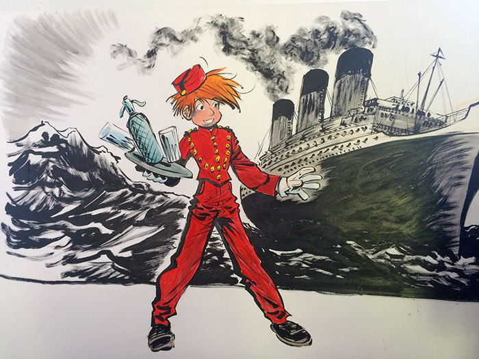 « Yves Sente m’a soumis un projet autour de Spirou. D’emblée, je lui ai répondu qu’étant déjà catalogué dessinateur de reprise, cela ne m’intéressait pas; mais il a insisté en me disant qu’il ne s’agissait pas d’une aventure de Spirou, mais de l’histoire du groom ayant inspiré Rob-Vel. Ce dernier a été steward sur les transatlantiques qui reliaient Le Havre à New York, et sur lesquels travaillaient aussi des grooms. Il avait eu l’occasion d’en rencontrer un qui était rouquin et débrouillard. Plus tard, quand il est devenu dessinateur de BD et que Dupuis lui a demandé de créer le personnage de Spirou, Rob-Vel s’est souvenu de ce groom du [sur]nom de Ptirou. Yves a lu cette anecdote dans la monographie des Pissavy-Yvernault : La Véritable Histoire de Spirou (Dupuis, 2013). J’ai donc accepté, parce qu’il ne s’agissait pas en effet d’une histoire avec Spirou, mais d’un one-shot. Dupuis a signé le projet, qui fera partie de la collection « Spirou par… ». Yves Sente a écrit le scénario, fait le découpage, et j’ai attaqué le dessin au printemps 2014. »