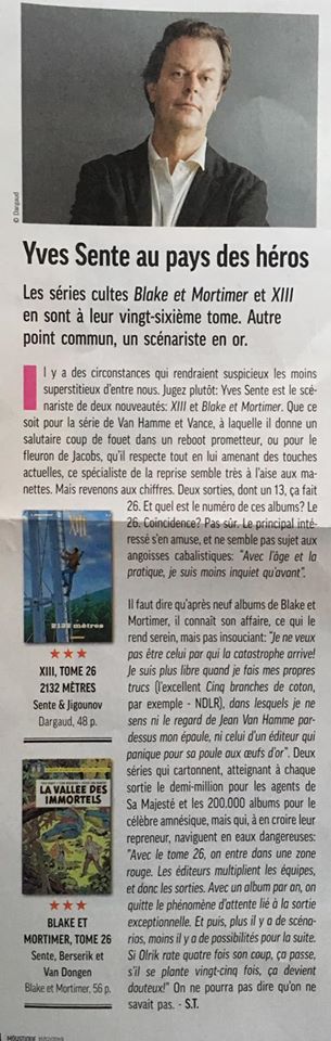 Un entretien avec Yves Sente a été diffusé en janvier sur le site de la RTBF radio (il faut s’enregistrer pour l’écouter, durée 10 minutes). Il revient sur son parcours comme scénariste BD, en particulier sa rencontre avec Blake et Mortimer. En voici un extrait :